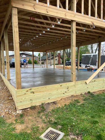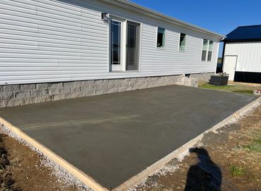 We pour home, garage and barn concrete floors using a minimum of 4000 psi concrete and a 4 inch thickness. We place vapor barrier to prevent floor sweating. We use rebar or wire mesh to reinforce the concrete. We typically mix fibers into our concrete which reduces the chance of shrinkage cracking.